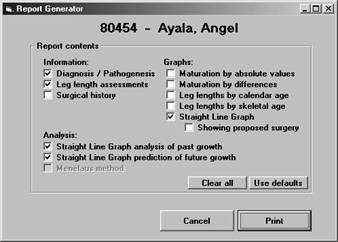 Print reportThis menu item leads you to a dialog box which allows you to select the components you want Pedipod/LLD to include in a printed report. Everything that can be displayed on the screen can be printed in a report Pedipod/LLD