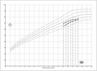 In these graphs Pedipod/LLD shows the patient’s leg lengths plotted over the data of the Boston Growth Study. Lines representing the means and one and two standard deviations above and below the mean in that study are shown.
