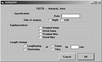 Information menu This is the menu you will use for entering data for your patients. The data fall into four groups: demographic, diagnostic, assessments of leg length and skeletal age, and surgeries. DemographicsThis